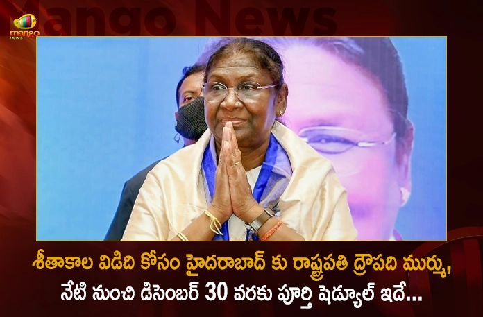 భారత రాష్ట్రపతి ద్రౌపది ముర్ము శీతాకాల విడిదిలో భాగంగా నేటి నుంచి (డిసెంబర్ 26, సోమవారం) నుండి డిసెంబర్ 30వ తేది వరకు తెలంగాణ రాష్ట్రంలో పర్యటించనున్నారు. సికింద్రాబాద్ బొల్లారంలోని రాష్ట్రపతి నిలయంలో రాష్ట్రపతి ద్రౌపది ముర్ము విడిది చేయనున్నారు. రాష్ట్రంలో జరిపే ఐదు రోజుల పర్యటనలో భాగంగా భద్రాచలం, రామప్ప సహా ఏపీలోని శ్రీశైలం ఆలయాన్ని రాష్ట్రపతి సందర్శించనున్నారు.