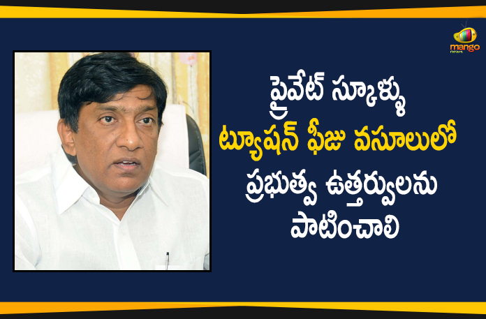 కరోనా పరిస్థితుల నేపథ్యంలో రాష్ట్ర ప్రభుత్వం జారీ చేసిన జీ.ఓ.ఆర్.టీ నంబర్.46 ప్రకారం మాత్రమే ప్రభుత్వ గుర్తింపు పొందిన ప్రైవేట్ పాఠశాలలు ప్రతి నెల ట్యూషన్ ఫీజును వసూలు చేయాలని తెలంగాణ రాష్ట్ర ప్రణాళికా సంఘం వైస్ చైర్మన్ బోయినపల్లి వినోద్ కుమార్ స్పష్టం చేశారు. తెలంగాణ రికగ్నైస్డ్ స్కూల్స్ మేనేజ్మెంట్ అసోసియేషన్ (ట్రస్మా) ప్రతినిధులు సెప్టెంబర్ 2, బుధవారం నాడు అధికారిక నివాసంలో భేటీ అయిన సందర్భంగా వినోద్ కుమార్ ఈ స్పష్టతనిచ్చారు.