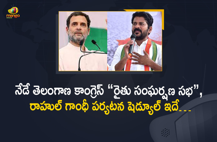 కాంగ్రెస్ పార్టీ కీలకనేత, ఎంపీ రాహుల్ గాంధీ నేడు, రేపు తెలంగాణ రాష్ట్రంలో పర్యటించనున్నారు. శుక్రవారం సాయంత్రం వరంగల్ ఆర్ట్స్ కాలేజ్ మైదానంలో తెలంగాణ కాంగ్రెస్ నిర్వహిస్తున్న “రైతు సంఘర్షణ సభ” సభలో రాహుల్ గాంధీ పాల్గొననున్నారు. రాష్ట్రంలో రాహుల్ గాంధీ పర్యటనను తెలంగాణ కాంగ్రెస్ ప్రతిష్టాత్మకంగా తీసుకుంది. రాహుల్ గాంధీ ఆధ్వర్యంలో జరిగే “రైతు సంఘర్షణ సభ”కు తెలంగాణ కాంగ్రెస్ నాయకులు ఇప్పటికే అన్ని ఏర్పాట్లు పూర్తి చేశారు. టీపీసీసీ అధ్యక్షుడుగా రేవంత్ రెడ్డి బాధ్యతలు స్వీకరించాకా రాహుల్ గాంధీ రాష్ట్రంలో పర్యటించడం ఇదే తొలిసారి. ముందుగా ఈ సభకై జన సమీకరణ కోసం జిల్లాల వారిగా సమావేశాలు నిర్వహించారు. రాష్ట్రంలోని ప్రతి రైతు కుటుంబం నుంచి ఒక్కరు చొప్పున సభకు రావాలని రేవంత్ రెడ్డి పిలుపునిచ్చారు. ఈ సభకు 5 లక్షల మందికిపైగా హాజరు కానున్నట్టు తెలుస్తుంది.