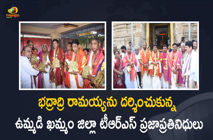 ఉమ్మడి ఖమ్మం జిల్లాకు చెందిన పలువురు టీఆర్ఎస్ ప్రజాప్రతినిధులు శనివారం ఉదయం భద్రాద్రి శ్రీ సీతారామచంద్ర స్వామి వారిని దర్శించుకున్నారు. భద్రాద్రి రామయ్యను దర్శించుకున్న వారిలో టీఆర్ఎస్ రాజ్యసభ ఎంపీలు బండి పార్థసారధి రెడ్డి, వద్దిరాజు రవిచంద్ర, ఖమ్మం ఎంపీ నామా నాగేశ్వరరావు, ఎమ్మెల్సీ తాత మధు, ప్రభుత్వ విప్, పినపాక టీఆర్ఎస్ ఎమ్మెల్యే రేగా కాంతారావు, సత్తుపల్లి టీఆర్ఎస్ ఎమ్మెల్యే సండ్ర వెంకట వీరయ్య, వైరా టీఆర్ఎస్ ఎమ్మెల్యే రాములు నాయక్ లతో పాటుగా పలువురు నేతలు ఉన్నారు. ముందుగా ఆలయం వద్దకు వచ్చిన టీఆర్ఎస్ ప్రజా ప్రతినిధులకు ఆలయ అర్చకులు, ఆలయ ఈఓ శివాజీ ఆలయ మర్యాదలతో ఘనంగా స్వాగతం పలికారు. అనంతరం ప్రధాన ఆలయంలో స్వామివారికి అర్చకులు నిర్వహించిన ప్రత్యేక పూజల్లో పాల్గొన్నారు. ఈ సందర్భంగా ప్రజా ప్రతినిధులకు వేద పండితులు