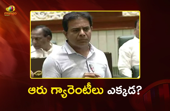 ఆరు గ్యారెంటీలు ఏమయ్యాయి? ఎన్నికల మేనిఫెస్టోలో పెట్టిన ఆరు గ్యారెంటీలను కాంగ్రెస్ ప్రభుత్వం పక్కన పెట్టేసిందని కేటీఆర్ ఆరోపించారు.