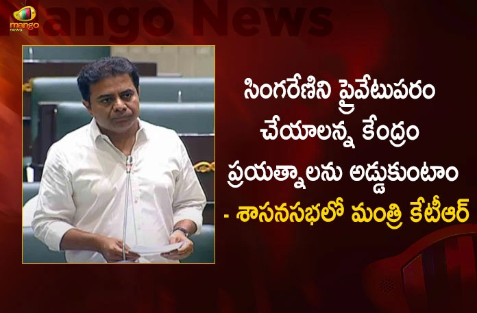 సింగరేణిని ప్రైవేటుపరం చేయాలన్న కేంద్ర ప్రభుత్వ కుట్రను భగ్నం చేస్తామని, వారి ప్రయత్నాలను అడ్డుకుంటామని స్పష్టం చేశారు తెలంగాణ మంత్రి కేటీఆర్. శాసనసభలో జరుగుతున్న బడ్జెట్ పద్దులపై చర్చలో భాగంగా ఆయన పాల్గొని ప్రసంగించారు. ఈ సందర్భంగా మంత్రి కేటీఆర్ మాట్లాడుతూ.. సింగరేణి బొగ్గు గనుల విషయంలో ప్రధాని మోదీ సహా పలువురు కేంద్ర మంత్రులకు సీఎం కేసీఆర్ ఇప్పటికే లేఖలు రాశారని, నాలుగు బొగ్గు గనులు తెలంగాణకు కేటాయించాలని కోరారని తెలిపారు. అయితే కేంద్రం దీనికి సమాధానంగా ఆ నాలుగు బొగ్గు గనులను వేలం వేస్తున్నామని, కావాలంటే వేలంలో పాల్గొని సొంతం చేసుకోవచ్చని చెప్పిందని వెల్లడించారు. దీంతో కేంద్రం ఉద్దేశాలు ఏంటో అర్ధమయ్యాయని చెప్పిన మంత్రి కేటీఆర్.. నేడు సభ ద్వారా సింగరేణి కార్మికులందరికీ మాటిస్తున్నామని, అవసరమైతే దీనికోసం ఎంత దూరమైనా పోతామని స్పష్టం చేశారు.