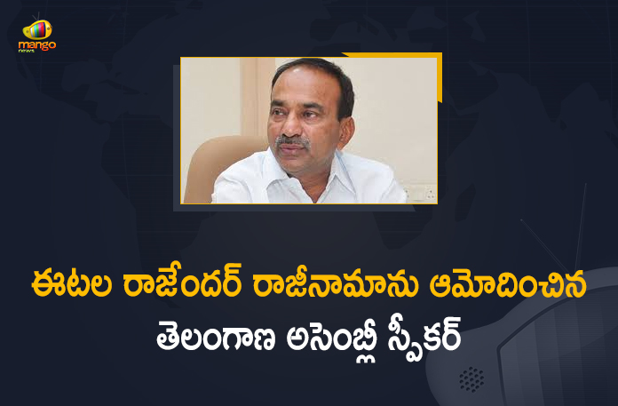 మాజీ మంత్రి ఈటల రాజేందర్ రాజీనామాను తెలంగాణ అసెంబ్లీ స్పీకర్ పోచారం శ్రీనివాసరెడ్డి ఆమోదించారు. అనంతరం హుజురాబాద్ అసెంబ్లీ నియోజకవర్గం ఖాళీ అయినట్టు అసెంబ్లీ సెక్రటరీ వి.నరసింహచార్యులు నోటిఫికేషన్ విడుదల చేశారు. ముందుగా శనివారం ఉదయం తన ఎమ్మెల్యే పదవికి ఈటల రాజేందర్ రాజీనామా చేశారు. ముందుగా తన ఇంటివద్ద నుంచి అనుచరులతో కలసి గన్పార్కు వద్దకు చేరుకున్న ఈటల అమరవీరుల స్థూపం వద్ద నివాళులు అర్పించారు. అనంతరం స్పీకర్ కార్యాలయంలో తన రాజీనామా లేఖను అసెంబ్లీ సెక్రటరీకి అందజేశారు. ఈ క్రమంలోనే ఈటల రాజీనామాని ఆమోదిస్తూ ఫైల్పై స్పీకర్ పోచారం శ్రీనివాస్రెడ్డి సంతకం చేశారు.