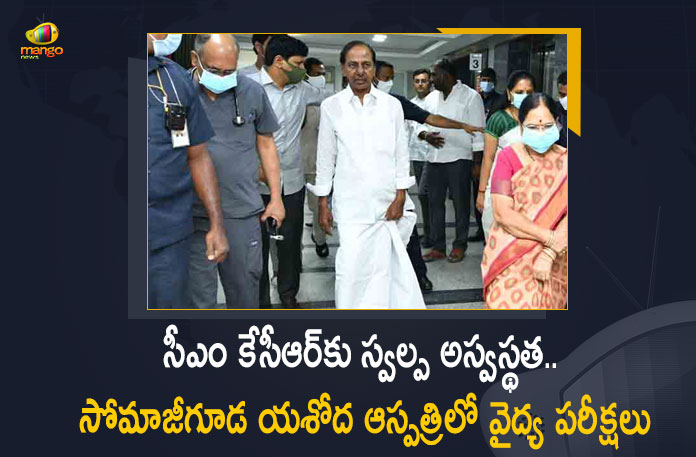 తెలంగాణ ముఖ్యమంత్రి కల్వకుంట్ల చంద్రశేఖర్ రావు ఈరోజు స్వల్ప అస్వస్థతకు గురయ్యారు. ఈ క్రమంలో.. సోమాజిగూడలోని యశోద ఆస్పత్రికి వైద్య పరీక్షల నిమిత్తం వెళ్లారు. ఆస్పత్రిలో సీఎం కేసీఆర్కు సిటీ స్కాన్, యాంజియోగ్రామ్ పరీక్షలు నిర్వహించనున్నట్లు ముఖ్యమంత్రి కార్యాలయం వెల్లడించింది. కేసీఆర్ వెంట ఆయన సతీమణి శోభ, ఎమ్మెల్సీ కవిత, ఎంపీ సంతోష్ కుమార్ ఉన్నారు. సీఎం కేసీఆర్ గత రెండు రోజుల నుంచి కొంచెం నీరసంగా ఉన్నారు. ప్రస్తుతం కేసీఆర్కు ముఖ్యమైన పరీక్షలు చేస్తున్నామని డాక్టర్ ఎంవీ రావు తెలిపారు. వైద్య పరీక్షల అనంతరం సీఎం కేసీఆర్ ఆరోగ్యానికి సంబంధించిన వివరాలు వెల్లడిస్తామని ఆయన తెలిపారు.