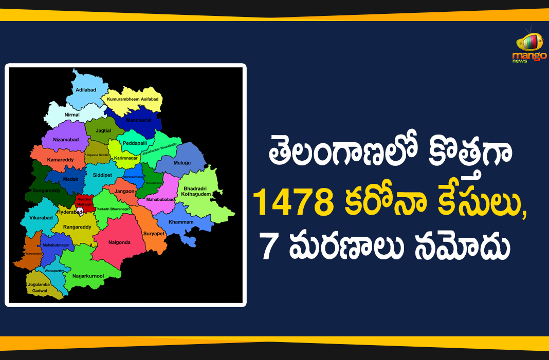 తెలంగాణలో రాష్ట్రంలో మరో 1478 కరోనా పాజిటివ్ కేసులు నమోదవడంతో జూలై 17, శుక్రవారం సాయంత్రం 5 గంటల నాటికీ మొత్తం కేసుల సంఖ్య 42,496 కి చేరినట్టు రాష్ట్ర వైద్య ఆరోగ్యశాఖ బులెటిన్ విడుదల చేసింది. శుక్రవారం నాడు 15,124 శాంపిల్స్ పరీక్షించినట్టుగా పేర్కొన్నారు. తాజాగా నమోదైన కరోనా పాజిటివ్ కేసుల్లో అత్యధికంగా జీహెచ్ఎంసీ పరిధిలో 806, రంగారెడ్డి జిల్లాలో 91, మేడ్చల్ లో 82, కరీంనగర్లో 77, వరంగల్ అర్బన్లో 51, పెద్దపల్లిలో 35, నల్గొండలో 35, కామారెడ్డిలో 31, రాజన్నసిరిసిల్లలో 27, మెదక్ లో 23, నాగర్కర్నూల్ లో 23, సూర్యాపేటలో 20, సంగారెడ్డిలో 20, మహబూబ్నగర్లో 19, ఖమ్మంలో 18, వికారాబాద్లో 17, మంచిర్యాలలో 15, నారాయణపేటలో 14, యాదాద్రి భువనగిరి లో 11, కొమరంభీం ఆసిఫాబాద్ లో 11, నిజామాబాద్ లో 11, మహబూబాబాద్లో 11 నమోదయ్యాయి.
