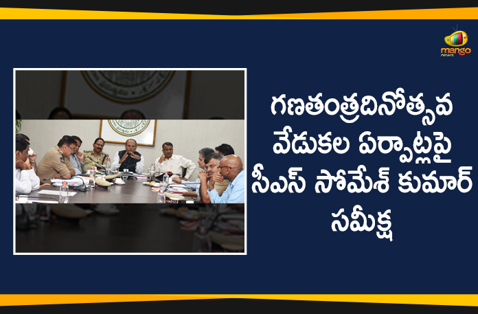 గణతంత్రదినోత్సవ వేడుకల ఏర్పాట్లపై జనవరి 17, శుక్రవారం నాడు బి.ఆర్.కె.ఆర్. భవన్ లో తెలంగాణ రాష్ట్ర ప్రభుత్వ ప్రధాన కార్యదర్శి సోమేశ్ కుమార్ సంబంధిత శాఖల అధికారులతో సమన్వయ సమావేశం నిర్వహించారు. జనవరి 26వ తేదీ ఉదయం పబ్లిక్ గార్డెన్స్ లో గణతంత్ర దినోత్సవ వేడుకలు ప్రారంభమవుతాయన్నారు. పబ్లిక్ గార్డెన్స్ లో జరిగే గణతంత్ర దినోత్సవ వేడుకల ఏర్పాట్లు ఘనంగా నిర్వహించడానికి వివిధ శాఖల అధికారులు పకడ్భంది ఏర్పాట్లు చేపట్టాలని సోమేశ్ కుమార్ ఆదేశించారు. వేడుకలకు అవసరమైన పోలీసు బందోబస్తు, ట్రాఫిక్ నియంత్రణ ఏర్పాట్లు, బారికేడింగ్ తదితర ఏర్పాట్లు చేయాలని ఆదేశించారు. ఈ సమావేశంలో జిఏడి ప్రత్యేక ప్రధాన కార్యదర్శి అధర్ సిన్హా, డిజిపి మహేందర్ రెడ్డి, సమాచార పౌర సంబంధాల శాఖ కమీషనర్ అర్వింద్ కుమార్, రహదారులు, భవనాల శాఖ ముఖ్యకార్యదర్శి సునీల్ శర్మ, హైదరాబాద్ పోలీస్ కమీషనర్ అంజనీ కుమార్ తదితర శాఖల అధికారులు పాల్గొన్నారు.