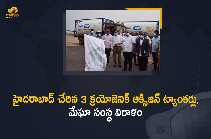 హైదరాబాద్ చేరిన 3 క్రయోజెనిక్ ఆక్సిజన్ ట్యాంకర్లు, మేఘా సంస్ధ విరాళం