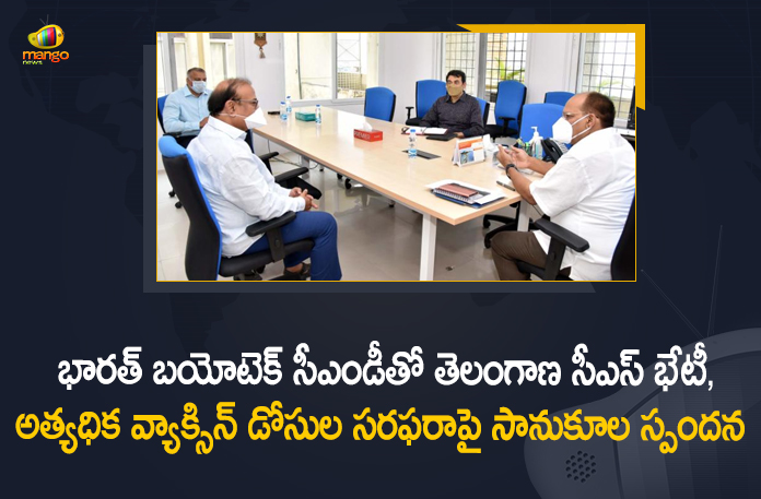 ముఖ్యమంత్రి కె.చంద్రశేఖర్ రావు ఆదేశాల మేరకు తెలంగాణ రాష్ట్ర ప్రభుత్వ ప్రధాన కార్యదర్శి సోమేశ్ కుమార్ మంగళవారం నాడు భారత్ బయోటెక్ సీఎండీ కృష్ణా ఎల్లా తో బి.ఆర్.కె.ఆర్ భవన్ లో సమావేశమయ్యారు. ఈ సందర్భంగా సీఎస్ సోమేశ్ కుమార్ మాట్లాడుతూ, సీఎం కేసీఆర్ కోవిడ్-19 వ్యాప్తి నివారణలో భాగంగా రాష్ట్ర ప్రజలందరికి ఉచితంగా వ్యాక్సినేషన్ నిర్వహించాలని నిర్ణయించారని తెలిపారు. ఈ నేపథ్యంలో రాష్ట్రంలో ప్రజలందరికి వ్యాక్సినేషన్ చేపట్టటానికి తెలంగాణ రాష్ట్రానికి అత్యధిక డోసులను సరఫరా చేయడంలో ప్రాధాన్యతనివ్వాలని భారత్ బయోటెక్ సీఎండీ కృష్ణా ఎల్లాను కోరారు. దీనికి సంబంధించి తెలంగాణ రాష్ట్రానికి అత్యధిక వ్యాక్సిన్ లు ఇవ్వటానికి ఆయన సానుకూలంగా స్పందించారని తెలిపారు. ఈ సమావేశంలో పరిశ్రమల శాఖ ముఖ్యకార్యదర్శి జయేష్ రంజన్ మరియు భారత్ బయోటెక్ డైరెక్టర్ డా.సాయి ప్రసాద్ లు పాల్గొన్నారు.