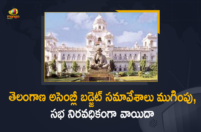తెలంగాణ అసెంబ్లీ నిరవధికంగా వాయిదా పడింది. ముందుగా తెలంగాణ రాష్ట్ర అసెంబ్లీ బడ్జెట్ సమావేశాలు మార్చి 7న ప్రారంభమయిన విషయం తెలిసిందే. నేటితో కలిపి మొత్తం ఏడు రోజుల పాటుగా సమావేశాలు జరగగా, శాసనసభను నిరవధికంగా వాయిదా వేస్తునట్టుగా స్పీకర్ పోచారం శ్రీనివాసరెడ్డి ఈ రోజు ప్రకటించారు. సభ నిర్వహణ సజావుగా జరిగేందుకు సహకరించినందుకు సభ్యులకు స్పీకర్ ధన్యవాదాలు తెలిపారు.