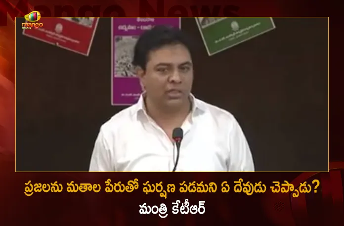 ప్రజలను మతాల పేరుతో ఘర్షణ పడమని ఏ దేవుడు చెప్పాడని ప్రశ్నించారు తెలంగాణ రాష్ట్ర ఐటీ, పురపాలక శాఖ మంత్రి కేటీఆర్. శనివారం ఆయన హైదరాబాద్ లోని డాక్టర్ బీఆర్ అంబేద్కర్ ఓపెన్ యూనివర్సిటీలో పోటీ పరీక్షల స్టడీ మెటీరియల్ను విద్యాశాఖ మంత్రి సబితా ఇంద్రారెడ్డితో కలిసి విడుదల చేశారు. ఈ సందర్భంగా మంత్రి కేటీఆర్ ప్రసంగిస్తూ.. నేడు దేశంలో, రాష్ట్రంలో కొందరు నాయకులు మత విద్వేషాలను రెచ్చగొడుతున్నారని, వీరి పట్ల ప్రజలు అప్రమత్తంగా ఉండాలని సూచించారు. దేశవ్యాప్తంగా గ్యాస్, డీజిల్, పెట్రోల్ ధరలు విపరీతంగా పెరిగిపోతున్నాయని, దీనిపై దృష్టి పెట్టకుండా బీజేపీ నాయకులు దేశంలో ప్రజల మధ్య వైషమ్యాలు సృష్టించడంలో బిజీగా ఉన్నారని మండిపడ్డారు. ఏ దేవుడు చెప్పాడు, ఏ మతం చెప్పింది ఎవరి దేవుడు గొప్ప అనే కాంపిటీషన్ పెట్టుకొని తన్నుకు చావండని? అని మంత్రి ప్రశ్నించారు. అభివృద్ధిపైన చిత్తశుద్దిలేని వారే ఇలాంటివాటిని ప్రోత్సహిస్తుంటారని వ్యాఖ్యానించారు.