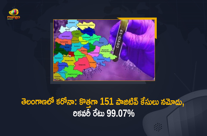 తెలంగాణ రాష్ట్రంలో రోజువారీ కరోనా పాజిటివ్ కేసుల నమోదు తగ్గుముఖం పట్టింది. కొత్తగా 151 మందికి కరోనా పాజిటివ్ గా నిర్ధారణ కావడంతో ఫిబ్రవరి 27, ఆదివారం సాయంత్రం 5:30 గంటల నాటికీ మొత్తం కరోనా కేసుల సంఖ్య 7,88,775కి చేరినట్టు రాష్ట్ర వైద్య ఆరోగ్యశాఖ బులెటిన్ విడుదల చేసింది. అలాగే కరోనా నుంచి మరో 453 మంది కోలుకోవడంతో ఇప్పటివరకు రికవరీ అయినవారి సంఖ్య 7,81,427 కి చేరింది. రాష్ట్రంలో కరోనా రికవరీ రేటు 99.07 శాతంగా, మరణాల రేటు 0.52 శాతంగా ఉంది.