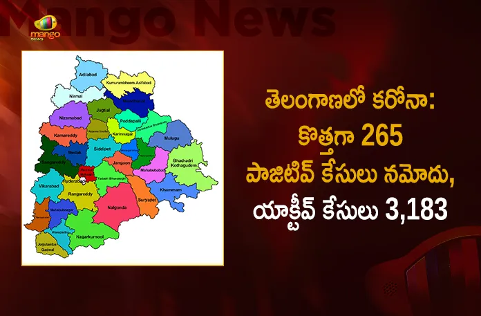తెలంగాణలో కరోనా వ్యాప్తి అదుపులోనే ఉంది. కోత్తగా 265 పాజిటివ్ కేసులు నమోదవడంతో ఆగస్టు 15, ఆదివారం సాయంత్రం 5:30 గంటల నాటికీ మొత్తం కేసుల సంఖ్య 8,29,467 కి చేరినట్టు రాష్ట్ర వైద్య ఆరోగ్యశాఖ బులెటిన్ విడుదల చేసింది. అత్యధికంగా హైదరాబాద్ లోనే 142 కేసులు నమోదయ్యాయి. మరోవైపు కరోనా వలన కొత్తగా ఎలాంటి మరణాలు నమోదు కాలేదు, దీంతో మొత్తం కరోనా మరణాల సంఖ్య 4,111 గా ఉంది. కరోనా రికవరీ రేటు 99.12 శాతంకాగా, మరణాల రేటు 0.49 శాతంగా నమోదైంది.
