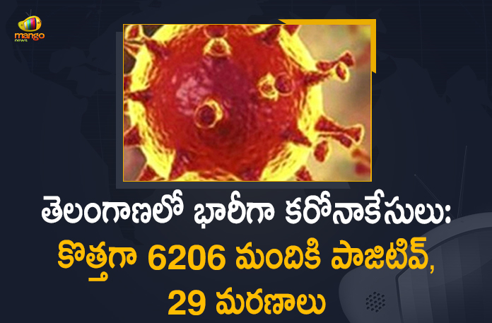 తెలంగాణ రాష్ట్రంలో గతకొన్నిరోజులుగా కరోనా పాజిటివ్ కేసులు పెద్ద సంఖ్యలో నమోదవుతున్నాయి. కొత్తగా 6206 కేసులు నమోదవడంతో ఏప్రిల్ 22, శుక్రవారం రాత్రి 8 గంటల వరకు మొత్తం పాజిటివ్ కేసుల సంఖ్య 3,79,494 కి చేరినట్టు రాష్ట్ర వైద్య ఆరోగ్యశాఖ బులెటిన్ విడుదల చేసింది. కరోనా వలన మరో ఇరవై తొమ్మింది మంది మరణించడంతో, రాష్ట్రంలో మొత్తం మరణాల సంఖ్య 1928 కి పెరిగింది. ఇక గత 24 గంటల్లో 3052 మంది కరోనా నుంచి కోలుకోగా, రికవరీ అయినవారి సంఖ్య 3,24,840 కు చేరుకుంది. ప్రస్తుతం 52,726 యాక్టీవ్ కేసులు ఉన్నాయి. మరోవైపు గురువారం నాడు 1,05,602 శాంపిల్స్ కు పరీక్షలు నిర్వహించడంతో మొత్తం పరీక్షల సంఖ్య 1,22,81,027 కు చేరగా, రాష్ట్రంలో ప్రతి పదిలక్షల జనాభాకు 3,29,957 పరీక్షలు నిర్వహించినట్టు పేర్కొన్నారు.