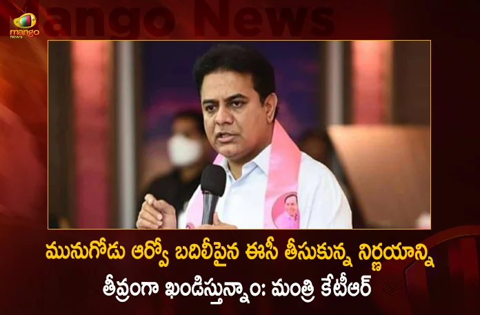 మునుగోడు ఉపఎన్నిక రిటర్నింగ్ ఆఫీసర్ బదిలీ వ్యవహారంపై టీఆర్ఎస్ వర్కింగ్ ప్రెసిడెంట్, మంత్రి కేటీఆర్ స్పందించారు. ఆర్వో బదిలీపై కేంద్ర ఎన్నికల సంఘం (ఈసీ) వ్యవహరించిన తీరు ఆక్షేపనీయమని కేటీఆర్ అన్నారు. భారతీయ జనతా పార్టీ (బీజేపీ) రాజ్యాంగ వ్యవస్థలను ఏ విధంగా దుర్వినియోగం చేస్తుందో తెలిపేందుకు ఇది ఒక మరో తార్కాణమని అన్నారు. పార్టీలకు అతీతంగా ప్రజాస్వామ్యస్ఫూర్తికి అద్దం పట్టే విధంగా వ్యవహరించాల్సిన ఈసీపైన బీజేపీ ఒత్తిడి స్పష్టంగా కనిపిస్తుందని కేటీఆర్ పేర్కొన్నారు. 2011లోనే సస్పెండ్ చేసిన రోడ్డు రోలర్ గుర్తును తిరిగి పెట్టడం ప్రజాస్వామ్య స్ఫూర్తిని అపహాస్యం చేయడమేనని అన్నారు.