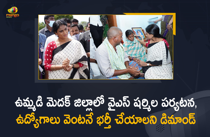దివంగత సీఎం వైఎస్ రాజశేఖర్రెడ్డి కుమార్తె వైఎస్ షర్మిల బుధవారం నాడు తెలంగాణ అవతరణ దినోత్సవం పురస్కరించుకుని ఉమ్మడి మెదక్ జిల్లాలో పర్యటించారు. వెల్దుర్తి మండలంలోని శేరిల్లా గ్రామంలో ఉద్యోగం కోసం ఆత్మహత్య చేసుకున్న వెంకటేశ్ కుటుంబాన్ని ఆమె పరామర్శించారు. ఈ సందర్భంగా షర్మిల మాట్లాడుతూ, తెలంగాణ రాష్ట్రం వచ్చి 7 ఏళ్లు గడిచినా కూడా ఉద్యమ లక్ష్యాలు దరిదాపుల్లో లేవన్నారు. “ప్రత్యేక రాష్ట్రం వస్తే నిరుద్యోగులకు ఉద్యోగ అవకాశాలు వస్తాయని అనుకున్నారు. ఈ రోజు అవే ఉద్యోగాల కోసం ఆత్మహత్యలు చేసుకుంటున్నారు. నిరుద్యోగులు చనిపోవడం తెలంగాణ ఉద్యమానికి అవమానం. 35 లక్షల మంది నిరుద్యోగులు ప్రభుత్వ ఉద్యోగాల కోసం ఎదురు చూస్తున్నారు. వయసు పెరిగిపోవడంతో ఉద్యోగాలు రాక ఎంతో మంది చనిపోతున్నారు” అని షర్మిల అన్నారు. వెంటనే లక్ష 30 వేల ఉద్యోగాలు భర్తీ చేయాలని ఆమె తెలంగాణ ప్రభుత్వాన్నికోరారు.